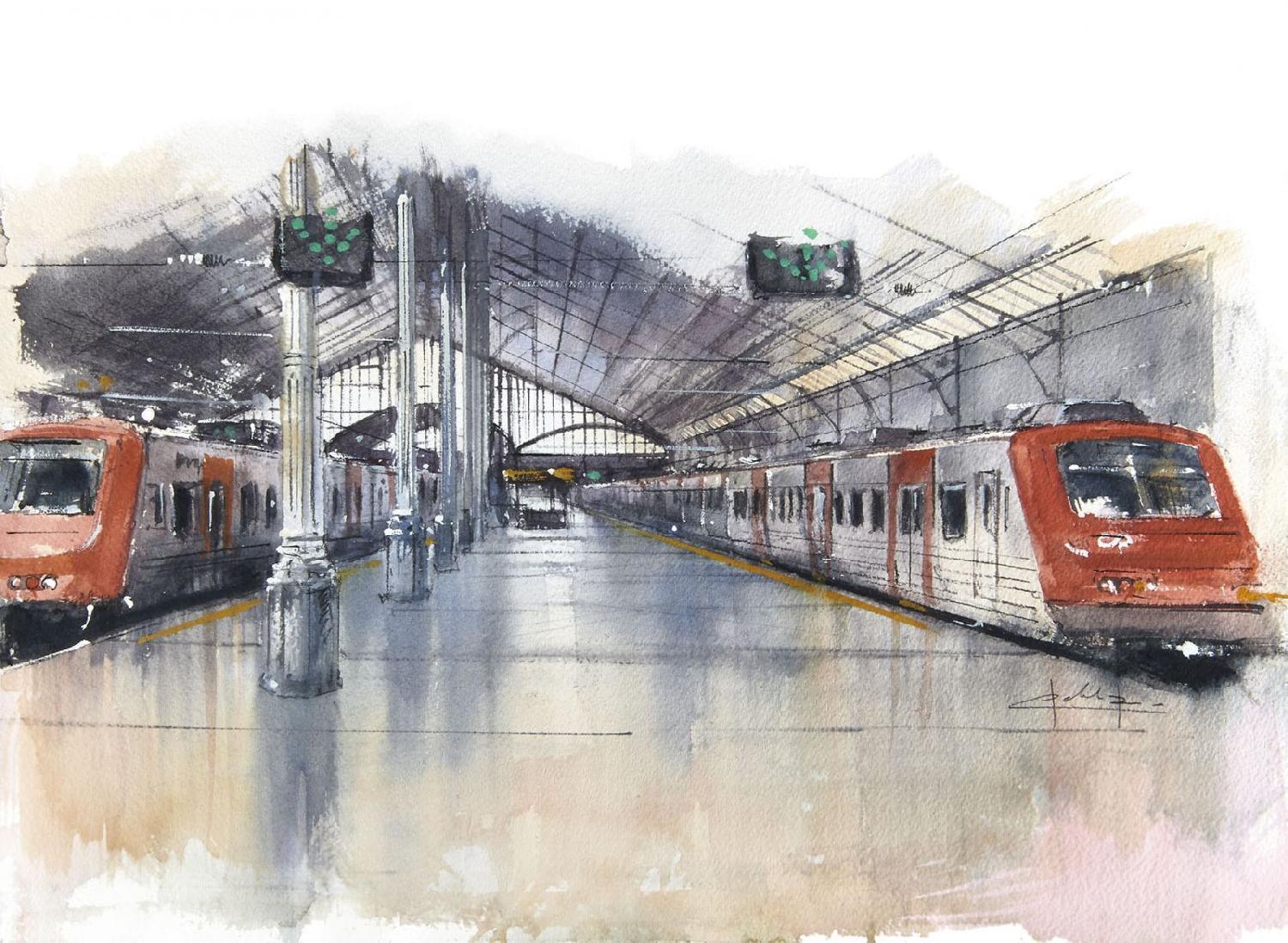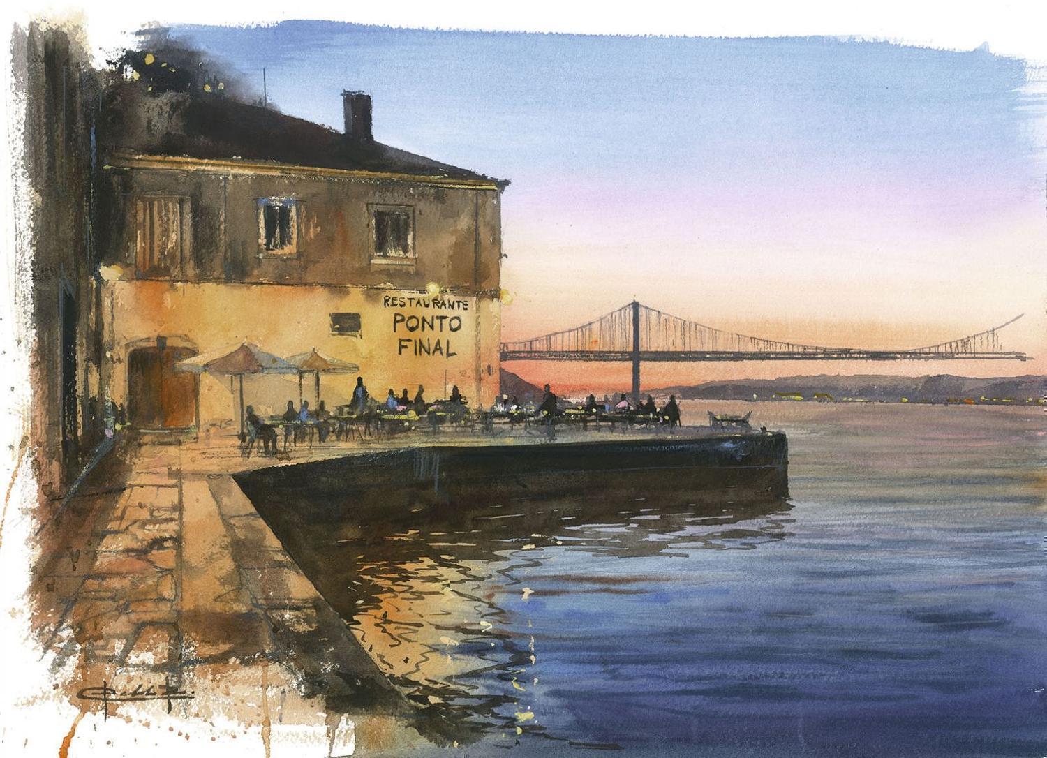 Las acuarelas de Lisboa de Pablo Rubén invitan a tener todos los sueños del mundo. Invitan a llegar o a partir hacia otros destinos oníricos desde las estaciones de Santa Apolónia, Rossio y Oriente; a perderse sin rumbo explorando el dédalo de callejuelas de Alfama y Mouraria, que tan bien retrata al pintar, por ejemplo, el Beco da Surra; a admirar la inmensidad proporcionada por las alturas de las siete colinas y de miradores como los de Graça, Senhora do Monte y el Parque Eduardo VII al atardecer; a atravesar con el ferri el estuario ante la imponente presencia del puente 25 de Abril; a desplazarse enlatados como sardinas en funiculares como los de Glória y Bica, o en tranvías tan emblemáticos como el 28; a visitar tiendas y cafés con historia, mercados y mercadillos como la Feira da Ladra; a saborear los suculentos platos de su gastronomía; a anestesiarse los oídos con el fado, Patrimonio Inmaterial de la Humanidad.